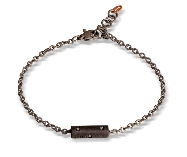 Bracciale uomo in titanio, diamanti white e catena con contromaglia in oro rosso 18 kt. Un cilindro in titanio sabbiato è il protagonista di questo innovativo, moderno e prezioso bracciale. Sulla superficie del cilindro sono incastonati 6 diamanti white da 1 punto per una caratura totale di 6 punti mentre, accanto alle incisioni laser "handmade in Italy" e "MANO", l'emblematico diamante black da 1 punto fa la sua comparsa. Il cilindro in titanio sabbiato è attraversato per l'intera lunghezza da una robusta catena che termina con una preziosa contromaglia in oro rosso 18 kt.