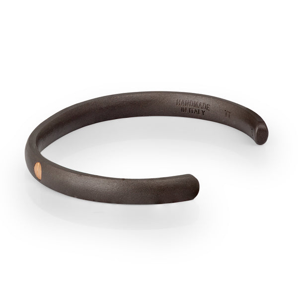 Bracciale uomo Linea Boost in titanio e oro rosso 9 kt. Un lineare e moderno bracciale alla schiava in titanio sulla cui superficie sono inseriti 5 viti in oro rosso 9 kt. La struttura, di grandi dimensioni, leggermente bombata e leggera consente massimo comfort e perfetta portabilità. All'interno del bracciale, accanto all'incisione MANO, si trova il diamante black da 1 punto testimonial del brand. Un prezioso ed innovativo gioiello in cui si alterna il colore intenso del titanio al colore caldo dell'oro rosso.