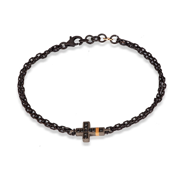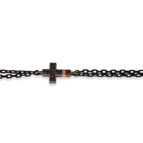 BRACCIALE UOMO CON 1 CROCE IN TITANIO,ORO ROSSO 18 KT E 9 KT, DIAMANTI BLACK E DOPPIA CATENA.