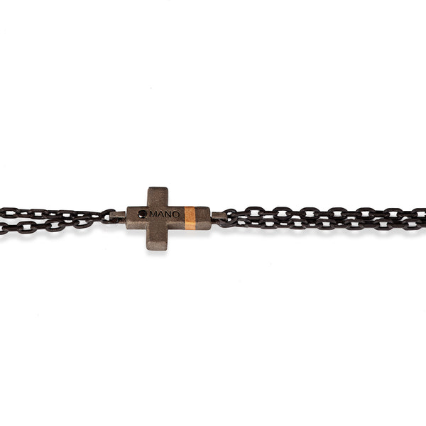Bracciale uomo in titanio, diamanti black, oro rosso 18 kt e oro rosso 9 kt. L'elemento centrale del bracciale è una croce in titanio con inserto in oro rosso 18 kt. I 10 diamanti black incastonati sulla croce, per una caratura totale di 10 punti, valorizzano il riporto di oro rosso 18 kt. Una doppia catena, collegata alla croce con due anellini in oro rosso 18 kt, costituisce lo sviluppo del bracciale al termine del quale si trova una preziosa chiusura a gancio in oro rosso 9 kt.. Ad impreziosire il bracciale, sotto la croce fa comparsa il diamante black da 1 punto che caratterizza il marchio MANO.