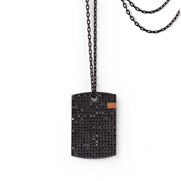 Collana uomo in titanio, oro rosso 18 kt, diamanti black, e oro rosso 9 kt. Una grande ed eccezionale targhetta in titanio completamente ricoperta di diamanti black è il soggetto dell'intera collana. L'incastonatura a pavè di questa targhetta in titanio è costituita da 305 diamanti black per una caratura totale di 3.05 ct. Posizionato su un lato superiore della stessa, si trova l'inserto in oro rosso 18 kt che arricchisce ulteriormente la collana. Attraverso il foro passante, la catena fa il suo passaggio per terminare con due anellini in oro rosso 9 kt e una chiusura a gancio in oro rosso 9 kt. Sul retro della targhetta, accanto all'incisione laser del marchio MANO, appare il diamante black da 1 punto particolare simbolo del trend.