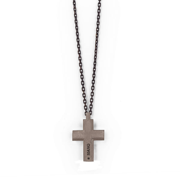 Collana uomo Linea Watt in titanio, diamanti black, oro rosso 9 kt e catena. La croce,che prende forma attraverso l'unione di sei borchie in titanio, è l'elemento principale di questa collana. All'apice di ogni borchia è incastonato un diamante black da 1 punto, per una caratura totale di 6 punti. Situato sula parte superiore della croce, un piccolo passante che permette alla catena di scorrere. La catena è resa ancor piu preziosa da un doppio anellino in oro rosso 9 kt e una chiusura a gancio in oro rosso 9 kt. Ad impreziosire e completare, il diamante black da 1 punto, testimonial del brand MANO, che si trova sul retro della croce. Una collana che unisce la classicità della croce alla creatività e modernità del marchio.