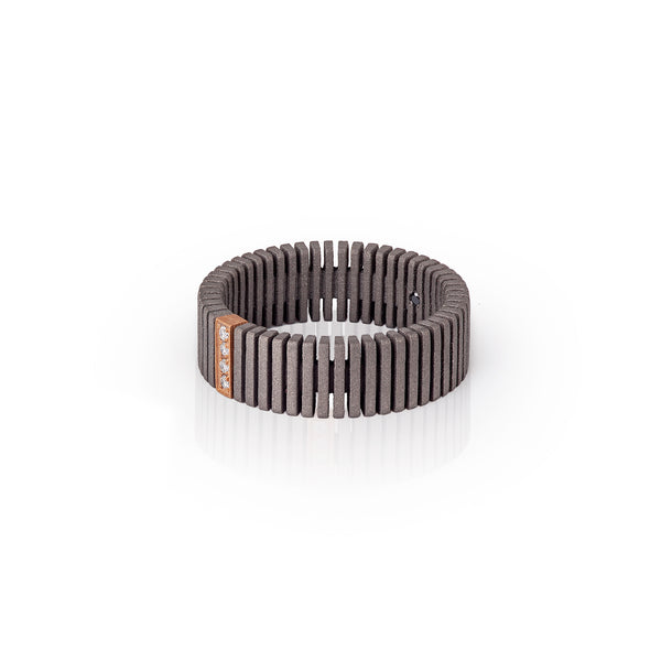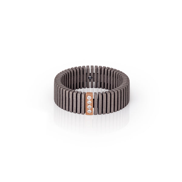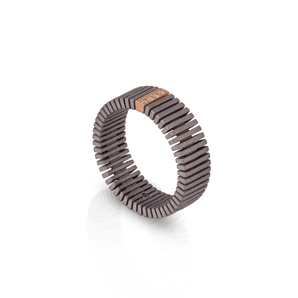 Anello uomo Sinth in titanio, diamanti white, oro rosso 18 kt e diamante black. Una fascia in titanio dalla linea innovativa, lineare, moderna. La struttura, suddivisa in sezioni, presenta sulla parte superiore un inserto in oro rosso 18 kt dove sono incastonati 4 diamanti bianchi per una caratura totale di 4 punti. All'interno del gambo, il diamante black da 1 punto, testimonial esclusivo del marchio MANO. Un anello che, per leggerezza, forma e comfort, puo' essere indossato in ogni occasione.