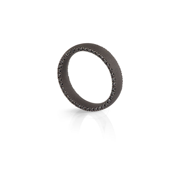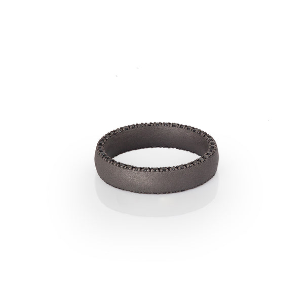 Fede matrimoniale eseguita interamente in titanio. Una preziosa fede matrimoniale in titanio dalla linea leggermente bombata è la struttura attorno alla quale si sviluppa l'intero anello. L'intero gioiello presenta sulle sezioni esterne una particolare incassatura, costituita da 80 diamanti black da 1 punto per una caratura totale di 80 punti. All'interno della fede, accanto al marchio MANO, fa la sua comparsa il diamante black da 1 punto testimonial del brand.