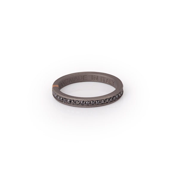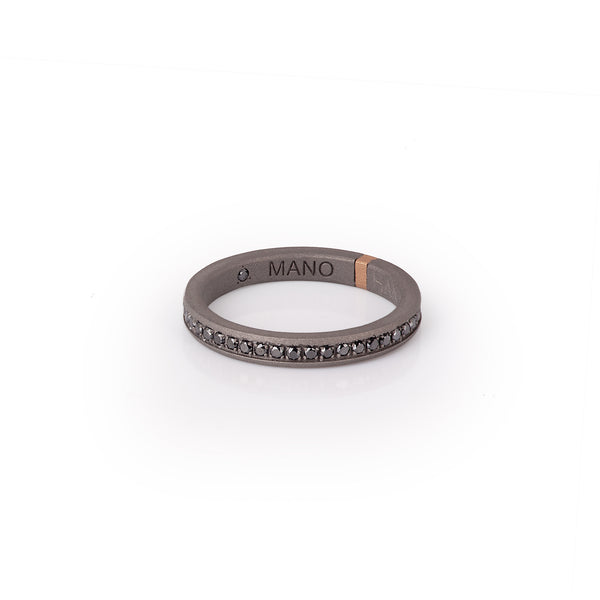Anello uomo in titanio diamanti black e oro rosso 18 kt. Una rivisitazione della più classica girodito, questa fedina è contornata da 43 diamanti neri per una caratura totale di 43 punti che raggiungono il punto in cui è stato inserito un riportino in oro rosso 18 kt. L'immancabile diamante black da 1 punto contraddistingue il marchio MANO. Una creazione che unisce leggerezza, eleganza e preziosità.
