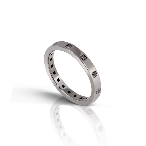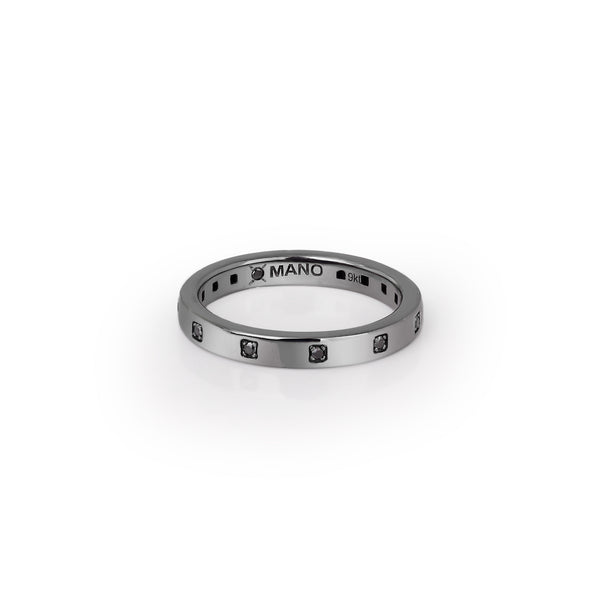 Anello uomo Linea Gold Minimal in oro 9 kt brunito gr 3.95 e diamanti black. Sull'intera circonferenza di questa fedina in oro bianco sono incastonati 10 diamanti black per una caratura pari a 10 punti. A rendere unico l'anello la superficie è rivestita da una rodiatura nera che dona effetto brunito all'intera struttura . Come firma simbolica del marchio MANO il diamante black da 1 punto posto all'interno del gambo. Un' elegante e preziosa veretta che per dimensioni e grammatura permette una perfetta indossabilità.