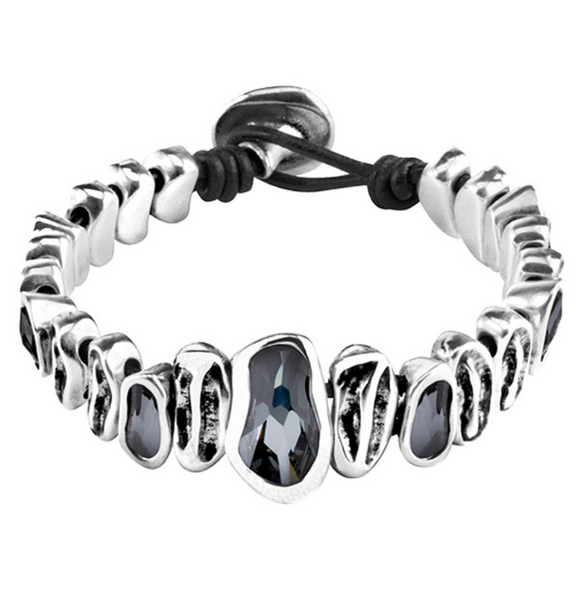 Bracciale che combina perle di dimensioni e forme irregolari che simulano le squame della pelle di coccodrillo, con bagno d’argento 15 micron e cristalli di color grigio.