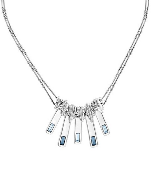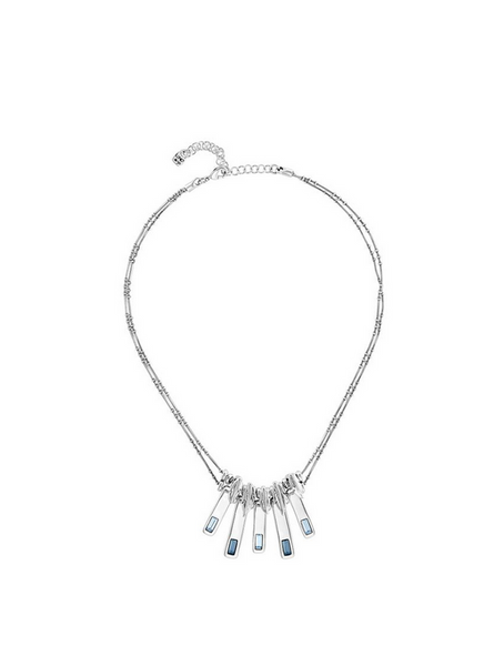 Collana lunga e flessibile di metallo bagnato nell'argento che presenta una semplice chiusura a moschettone con cui potrai indossare e togliere il pezzo più facilmente. Inoltre, presenta cinque charms al cui centro risaltano cristalli azzurri, che potrai indossare nelle occasioni speciali. Non esitare ad arricchire i tuoi look con questa collana.