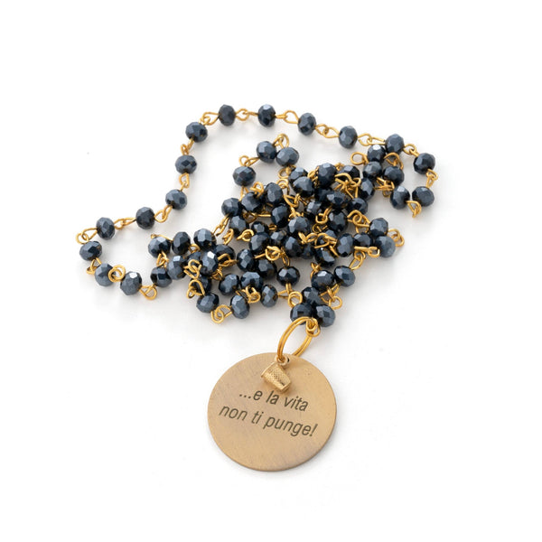 Collana Keep Out catena in ottone con pietre 80 cm, ditale 0,6 cm e placchetta in ottone "e la vita non ti punge". Catena unica senza chiusura. Disponibile in 2 varianti di colore