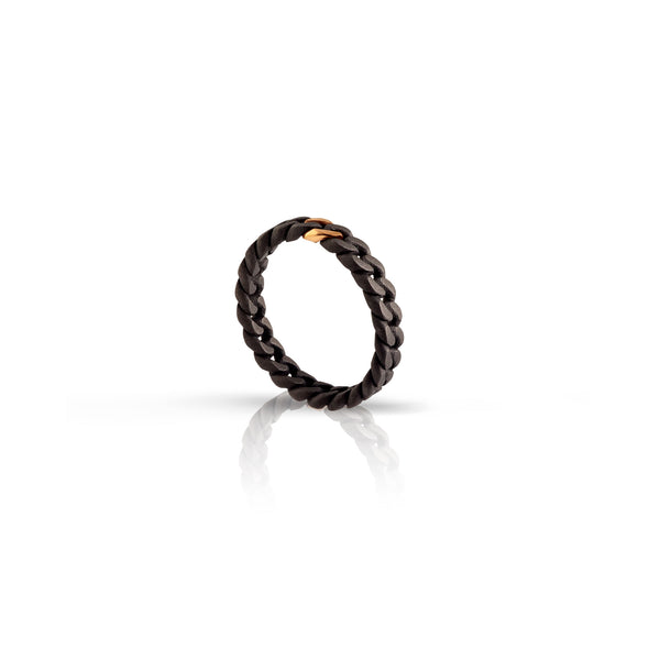Anello da uomo in titanio, oro rosso 9 ktParticolare anello in titanio costituito da una successione di maglie groumette non snodate. Ad impreziosire, è stata inserita una maglia in oro rosso 9 kt che crea un piacevole contrasto di colori.
