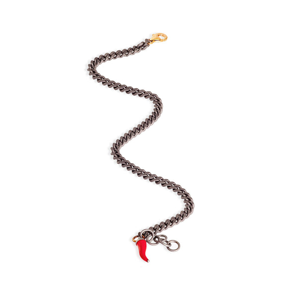 Bracciale uomo in titanio, chiusura in oro rosa 9 kt e charms rosso pendente. La catena groumette fine è l'elemento principale del bracciale che termina con una preziosa chiusura a gancio in oro rosa 9 kt e con un affascinante cornetto smaltato rosso pendente all'anellino in oro rosa 9kt. Un comodo e prezioso bracciale che per leggerezza e manifattura, permette massimo comfort e adattabilità ad ogni polso.
