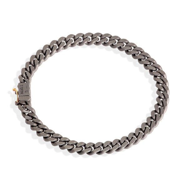 Bracciale uomo linea groumette in titanio e oro rosso 18 kt. Splendido bracciale con catena groumette in titanio e oro rosso 18 kt. La catena groumette in titanio è l'elemento principe del bracciale che termina con una pratica chiusura in titanio impreziosita da un otto di sicurezza in oro rosso 18 kt. Il testimonial del marchio MANO|J., il brillante black da 1 punto è incastonato sopra la chiusura groumette.Un prezioso ed importante gioiello firmato MANO|J. dove il diamante black e la leggerezza del titanio sono i veri protagonisti.